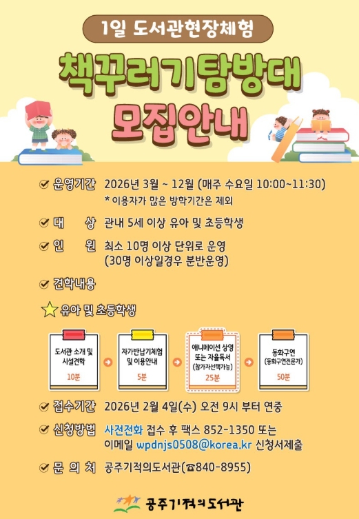 [뉴스노크=김인호 기자] 공주시는 오는 3월부터 12월까지 지역 어린이들을 대상으로 1일 도서관 현장체험 프로그램 ‘책꾸러기탐방대’를 운영한다고 밝혔다.