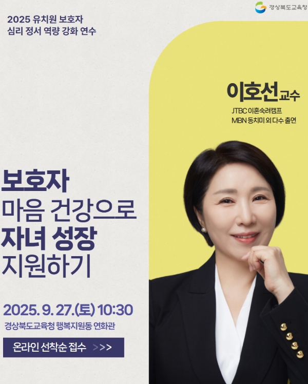 [뉴스노크=김인호 기자] 경북교육청은 오는 27일 오전 10시 30분, 본청 연화관에서 유치원 학부모를 대상으로 '보호자 심리·정서 역량 강화 연수'를 개최한다고 22일 밝혔다.