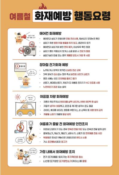 주요 행동요령으로는 △에어컨 실외기의 먼지 제거 및 전선 상태 확인 △침수된 전기기기는 반드시 전원을 차단한 뒤 전문가의 점검을 받을 것 △차량 내부에 라이터, 보조배터리 등 인화성 물질 방치 금지 △전기 모기향 사용 시 주기적 청소 및 안전한 위치 확보 등이 포함되어 있다.