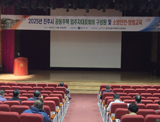 [뉴스노크=김인호 기자] 진주시는 지난 30일 무지개동산의 ‘평생학습관’ 다목적강당에서 의무관리 대상 공동주택 입주자대표회의 구성원과 시설물 안전관리 책임자 및 경비 책임자를 대상으로 ‘2025년 공동주택 입주자대표회의 구성원 교육 및 소방안전·방범 교육’을 실시했다.