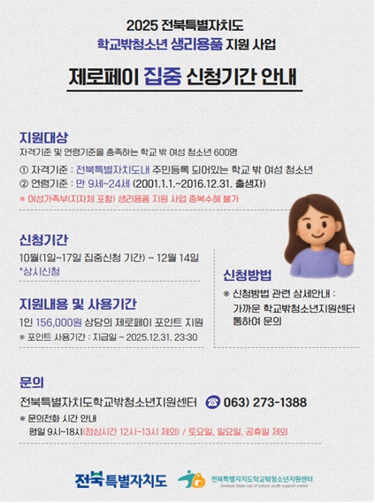 전북자치도 관계자는 “학교 밖 청소년들이 경제적 부담 없이 건강한 생활을 이어갈 수 있도록 적극 지원하겠다”며 “지원 대상자들이 혜택을 놓치지 않도록 기간 내 신청해달라”고 당부했다.