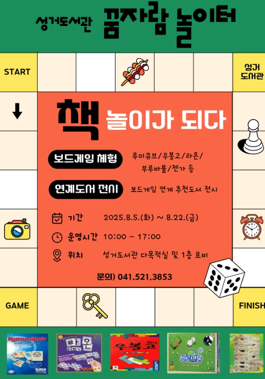 성거도서관 관계자는 “보드게임은 놀이를 통해 창의적 사고와 문제 해결 능력을 키울 수 있는 훌륭한 매개체”라며 “이번 여름방학 프로그램이 책과 놀이가 자연스럽게 어우러지는 의미있는 시간이 되기를 바란다”고 말했다.