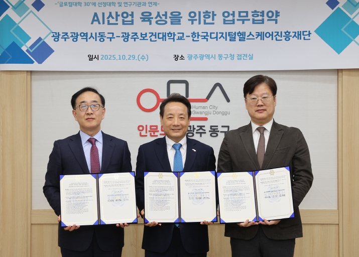 [뉴스노크=김인호 기자] 광주 동구는 지난 29일 구청 접견실에서 광주보건대학교(총장 김경태), 한국디지털헬스케어진흥재단(원장 박기원)과 인공지능(AI) 헬스케어 산업 육성, 인구 감소 해결, 원도심 활성화를 위한 업무협약을 체결했다고 밝혔다.