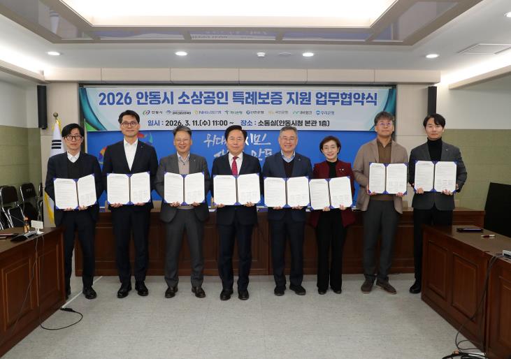 [뉴스노크=김인호 기자] 안동시는 3월 11일 시청 소통실에서 경북신용보증재단 및 6개 협약은행과 함께 '2026년 안동시 소상공인 특례보증 지원 업무협약'을 체결했다.
