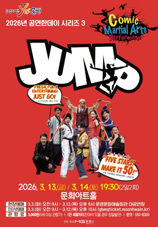 [뉴스노크=김인호 기자] 문경문화예술회관에서는 화려한 공중회전을 선보이는 아크로바틱과 고난이도 동양 무예, 슬랩스틱 코미디가 어우러진 넌버벌 퍼포먼스 점프(JUMP) 공연을 3월 13일 19:30, 14일 19:30 (2일 2회)에 문희아트홀에서 개최한다.