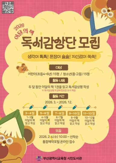 [뉴스노크=김인호 기자] 부산광역시립시민도서관(관장 이은경)은 오는 3월부터 12월까지 초·중·고 학생 30명을 대상으로 ‘이달의 책 독서감상단’을 운영한다.