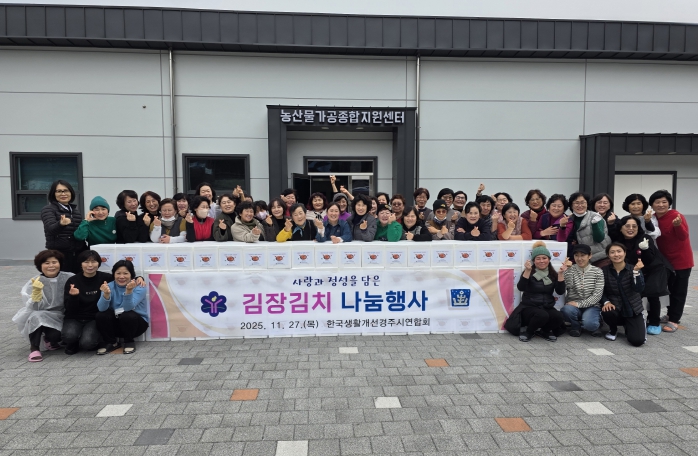 | ▲ 한국생활개선경주시연합회 회원들이 27일 내남면 신농업혁신타운 농산물가공종합지원센터에서 ‘김장김치 나눔행사’를 마치고 단체 기념촬영을 하고 있다 |