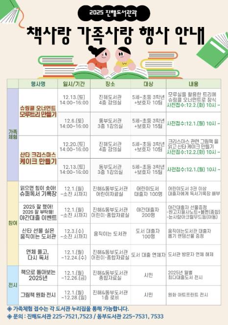 [뉴스노크=김인호 기자] 창원특례시 진해도서관과는 연말을 맞아 가족과 함께 즐길 수 있는 따뜻하고 풍성한 ‘2025 책사랑 가족사랑 행사’를 진해도서관 및 동부도서관에서 12월 한 달간 운영한다.
