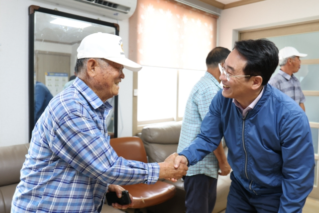 ▲ 폭염 속 강진원 군수가 칠량면 송산마을 경로당을 찾은 가운데 6·25참전용사와 대화를 나누며 여름철 건강 유지에 각별하게 유의해 달라고 당부하고 있다. |