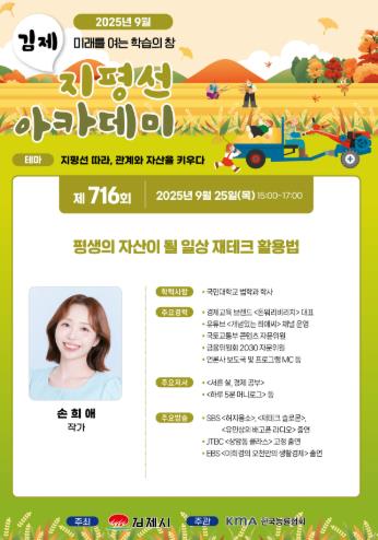 [뉴스노크=김인호 기자] 김제시는 오는 25일 제716회 지평선아카데미에 금융 크리에이터로 활동 중인 손희애 작가를 초청해 “평생의 자산이 될 일상 재테크 활용법”이라는 주제로 강연을 진행한다고 밝혔다.