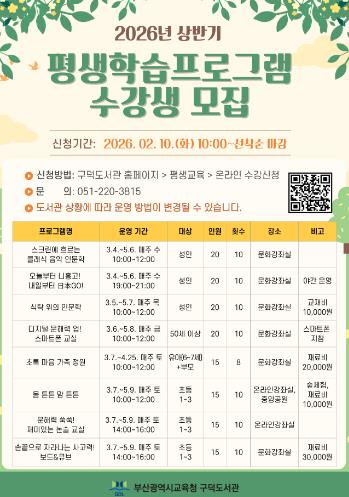 [뉴스노크=김인호 기자] 부산광역시립구덕도서관은 3월부터 5월까지 유아와 성인 140여 명을 대상으로 구덕도서관에서 ‘2026년 상반기 평생학습 프로그램’을 운영한다.