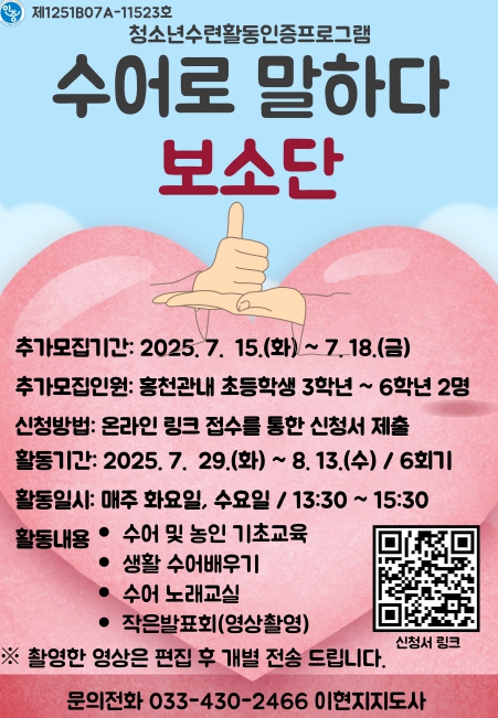 [뉴스노크=김인호 기자] 홍천군청소년문화의집은 지역 내 초등학생 3학년부터 6학년까지의 청소년들을 대상으로 하는 프로그램 청소년수련활동인증프로그램 “수어로 말하다 보소단”의 참가자를 모집한다.