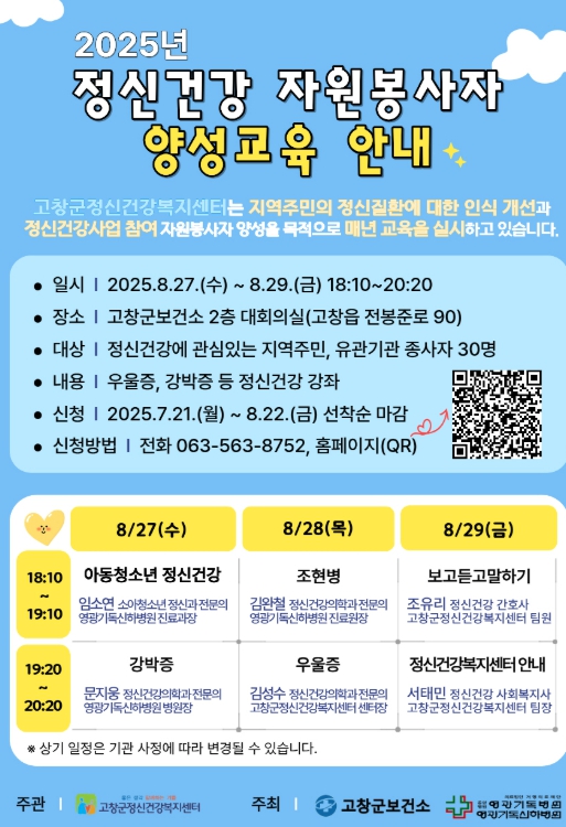 [뉴스노크=김인호 기자] 고창군정신건강복지센터가 오는 8월27~29일 고창군보건소 2층 대회의실에서 실시하는 ‘정신건강자원봉사자 양성교육’에 참여 주민을 모집한다.
