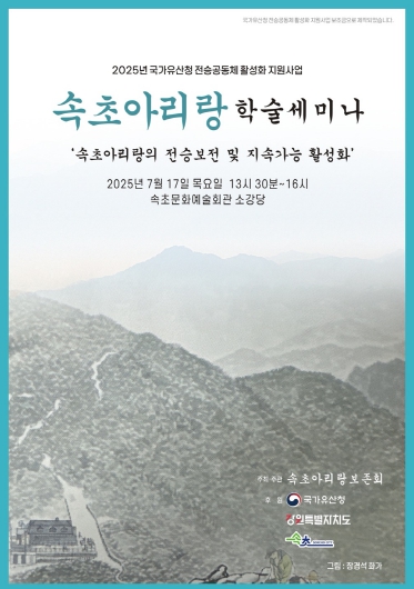 이번 세미나는 2025년 전승공동체 활성화 지원사업의 하나로, 속초아리랑의 보전과 발전 가능성을 학술적으로 모색하기 위해 마련됐으며, 국가유산청, 강원특별자치도, 속초시가 후원한다. 특히, 지난해 5월, 속초아리랑이 강원특별자치도 무형유산으로 지정된 이후 처음 열리는 학술적 전승 기반 마련 행사라는 점에서 더욱 큰 의미가 있다.