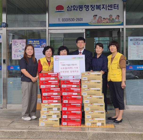 [뉴스노크=김인호 기자] 한화생명 금융서비스 동해지점(지점장 지종탁)에서 지난 17일 삼화동행정복지센터를 방문하여 라면 2종 20박스를 어려운 이웃들에게 전달해달라며 기탁했다.