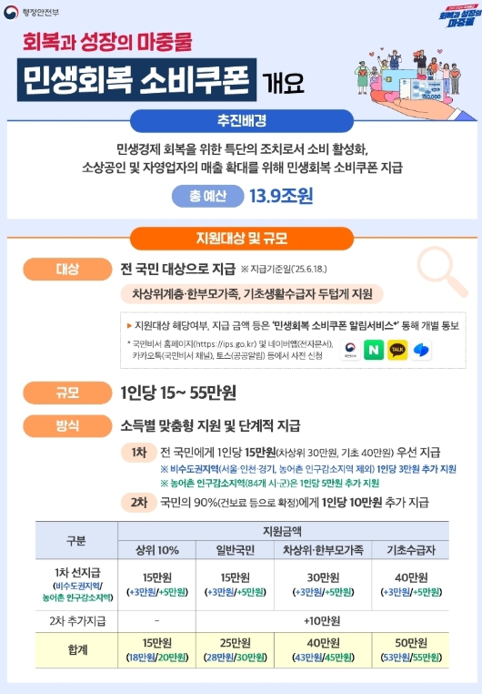 신청은 개인별로 이루어지며, 미성년자는 주민등록 세대주가 신청할 수 있고, 등본상 성인인 구성원이 없는 미성년 세대주는 직접 신청가능하다. 소비쿠폰 지급 방식은 신용·체크카드 또는 지역사랑상품권 중 선택할 수 있다.