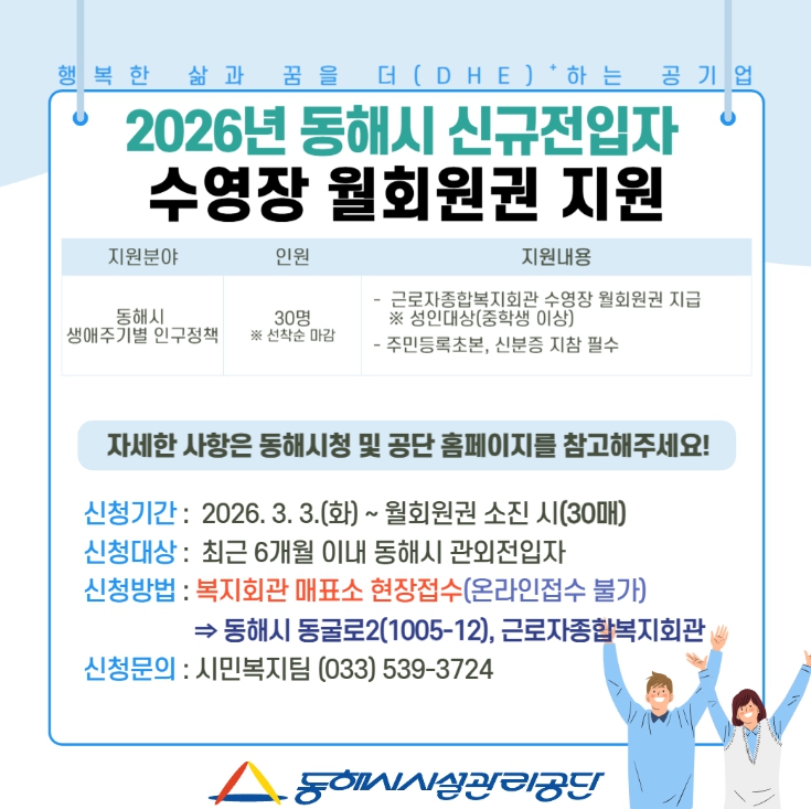 이번 수영장 월회원권 지원은 동해시 생애주기별 인구정책의 하나로, 동해시시설관리공단이 지방공기업으로서 시민 건강 증진과 신규 전입자 정착을 지원하기 위해 마련한 신규 인구정책지원 사업이며,최근 6개월 이내 동해시 관외 전입자를 대상으로, 오는 3월 3일부터 시행한다.