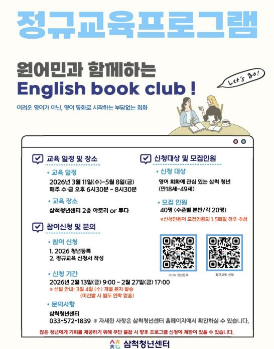 [뉴스노크=김인호 기자] 삼척청년센터는 지역 청년들의 영어 의사소통 능력을 높이고 자기계발 기회를 넓히기 위해 2026년 정규교육 프로그램 ‘영어회화 English Book Club’을 운영한다.