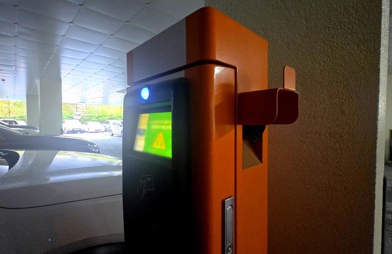 화성시 청목초등학교에 설치된 전기차 충전시설은 빗물에 노출되어 있어 최근 내린 폭우로 손잡이는 물에 젖어 있고, 충전기 안쪽은 먼지가 수북이 쌓여 있다.