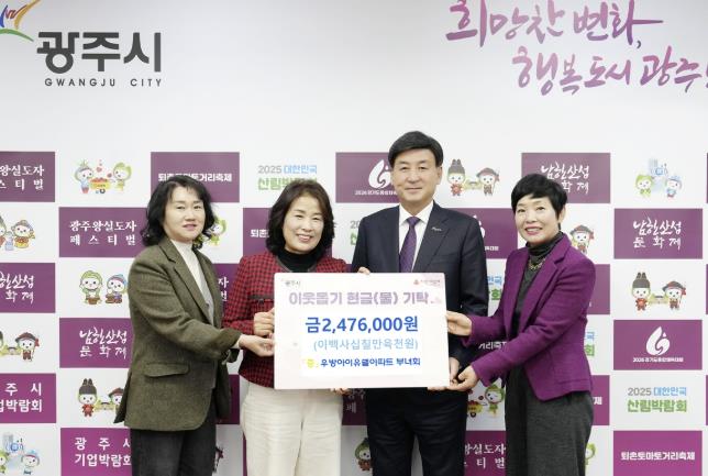 [뉴스노크=김인호 기자] 광주역우방아이유쉘아파트 부녀회는 지난 2일 지역 내 어려운 이웃을 위해 사용해 달라며 성금 247만 6천 원을 광주시에 기탁했다.
