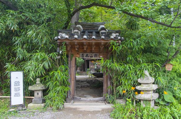 출입문 우측에는 삼층석탑이, 좌측에는 석등이 수호신처럼 지키고 있으며 촘촘한 대나무들이 담장을 대신한다. 마당으로 들어서면 연못이 가장 먼저 손님을 맞이한다. 연못 한쪽에는 물레방아가 돌아가고 중앙에는 석판으로 연결한 다리가 놓여 있어 운치를 더한다. 바람에 실린 나뭇잎의 속삭임과 나무 위에서 누군가를 부르는 듯한 새소리. 이곳의 이름이 왜 ‘새소리 물소리’인지 이해할 수 있는 풍경이다.
