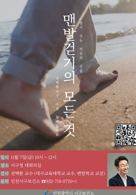 [뉴스노크=김인호 기자] 인천 서구는 오는 11월 7일에 서구청 대회의실에서 맨발학교 교장 ‘권택환 교수’ 초청 강연회를 진행한다고 밝혔다.