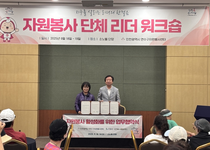 [뉴스노크=김인호 기자] 인천광역시 연수구자원봉사센터와 충청북도 단양군자원봉사종합센터는 18일 (단양소노벨)에서 지역간 자원봉사 활성화와 네트워크를 통해 지역사회 발전을 위한 업무협약(MOU)을 체결했다고 밝혔다.