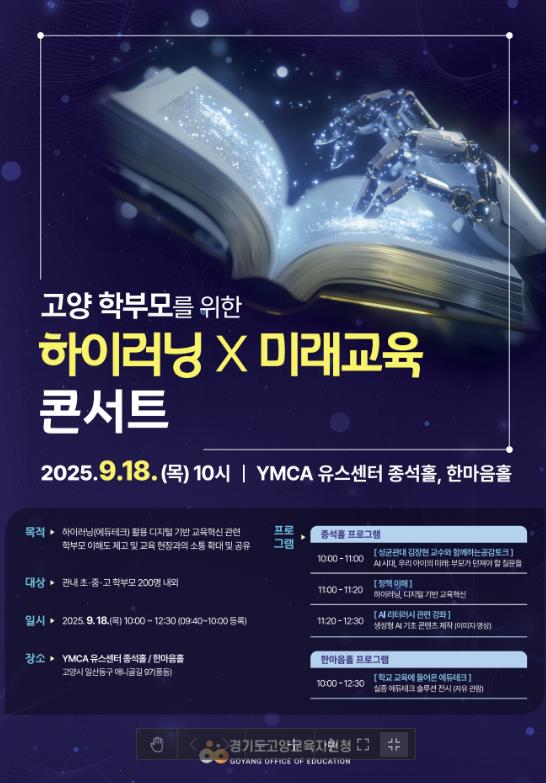 콘서트 형식으로 구성된 프로그램은 ▲AI 시대 자녀 교육에 대한 공감 토크(성균관대 김장현 교수), ▲고양 On 디지털 교육혁신 정책 브리핑, ▲생성형 AI 콘텐츠 체험, ▲하이러닝과 에듀테크 솔루션 전시 등으로 다채롭게 진행됐다.