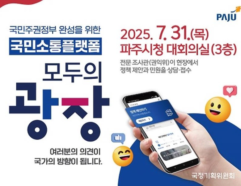 김경일 파주시장은 “국정기획위원회가 시민들의 제안을 현장에서 청취하고 이를 정책에 반영하겠다는 의지를 보여준 것에 감사하다”라며 “이번 기회에 많은 주민들께서 현장을 찾아와 소중한 의견을 전달해 주길 바란다”라고 말했다.