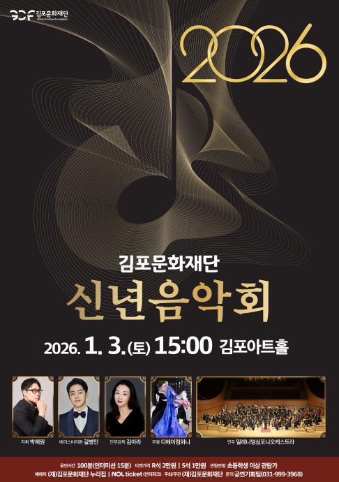 [뉴스노크=김인호 기자] (재)김포문화재단이 새해 첫 무대로 내년 1월 3일 김포아트홀에서 '2026년 김포문화재단 신년 음악회'를 개최한다고 밝혔다.