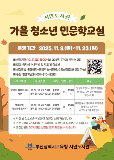 부산교육청 부산시민도서관, ‘가을 청소년 인문학교실’운영