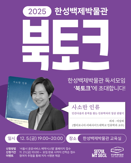 [뉴스노크=김인호 기자] 서울시 한성백제박물관은 올해 두 차례 운영된 역사독서모임 ‘북토크’를 12월 5일에 추가 개최한다고 밝혔다. 당초 연 2회 운영했으나 높은 시민 호응에 힘입어 추가 편성을 결정한 것이다. 이번 행사는 서울시 대표 야간문화 프로그램 ‘문화로 야금야금(夜金)’의 일환으로, 금요일 밤 박물관에서 역사학·고고학 분야 저자와 시민이 직접 소통할 수 있는 자리로 마련됐다.