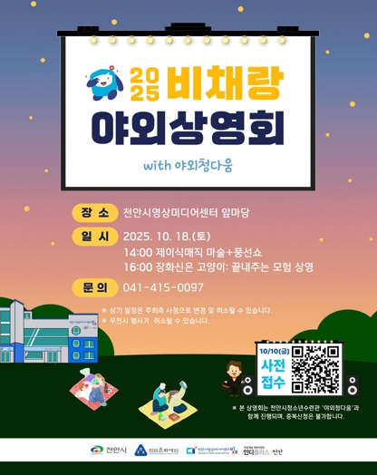 [뉴스노크=김인호 기자] 천안문화재단은 오는 18일 천안시영상미디어센터에서 ‘2025 비채랑 야외상영회’를 운영한다고 13일 밝혔다.