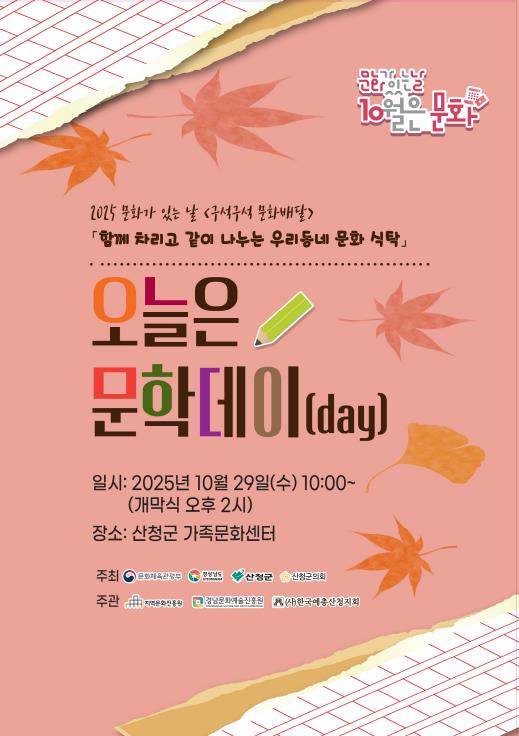 [뉴스노크=김인호 기자] 산청군은 오는 29일 가족문화센터에서 ‘오늘은 문학데이(day)’를 운영한다고 24일 밝혔다.