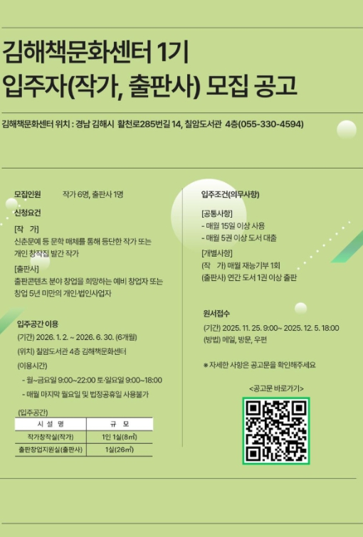 | ▲ 칠암도서관 ‘김해책문화센터 입주자(작가, 출판사) 모집’ |
