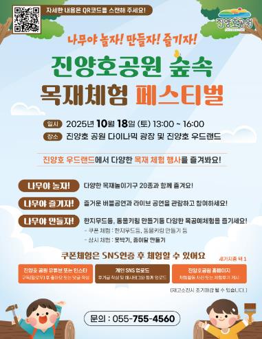 [뉴스노크=김인호 기자] 진주시는 오는 10월 18일 오후 1시부터 4시까지 진양호공원 다이나믹 광장과 진양호우드랜드 일원에서 『나무야 놀자! 만들자! 즐기자! 진양호 공원 숲속 목재체험 페스티벌』을 개최한다.