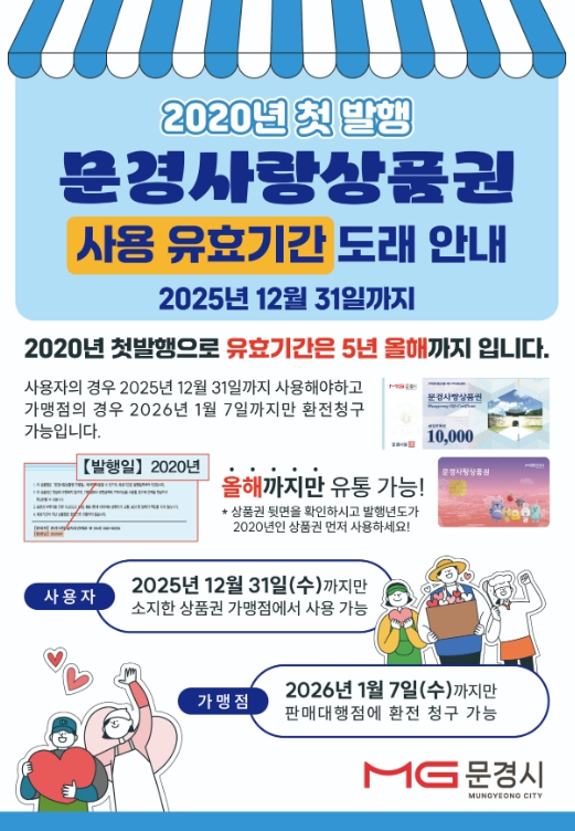 김동현 일자리경제과장은 “유효기간이 임박한 문경사랑상품권을 적극적으로 사용함으로써 지역 상권에 활력을 불어넣을 수 있는 좋은 기회가 될 것”이라며, 시민들의 미사용 상품권에 대한 권리를 보장하고 지역경제 활성화 정책에 대한 신뢰도를 높일 수 있길 바란다” 고 했다.