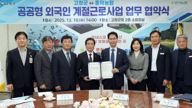 [뉴스노크=김인호 기자] 고창군과 흥덕농협이 지난 10일 2027년 공공형 계절근로사업 추진을 위한 업무협약(MOU)을 체결했다.