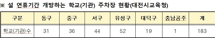 [뉴스노크=김인호 기자] 대전시교육청은 설 연휴 기간인 2월 14일부터 18일까지 대전을 찾는 귀성객과 지역 주민의 주차 편의를 위해 관내 각급 학교와 교육청, 산하기관 등 총 183곳의 주차장을 무료로 개방한다고 밝혔다.