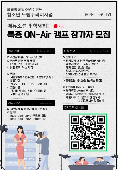 [뉴스노크=김인호 기자] 평창군이 예산을 지원하고 국립평창청소년수련원이 주관하는 청소년 미디어 진로 체험 ‘특종 ON-Air 캠프’가 8월 13일부터 15일까지 2박 3일간 국립평창청소년수련원과 조선일보 서울 본사에서 진행된다.