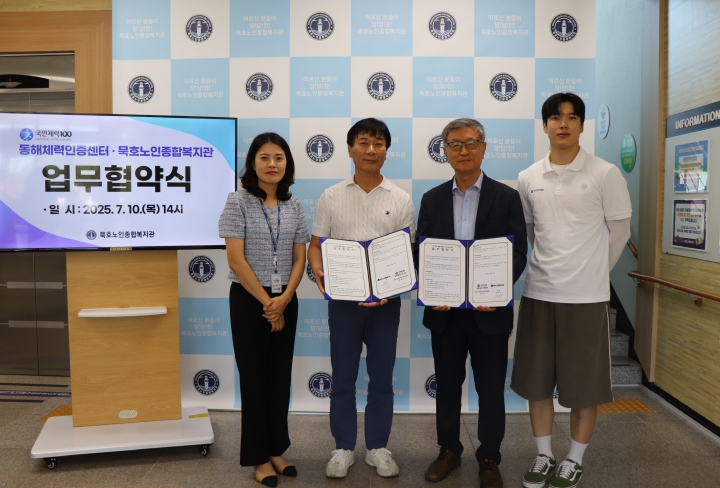 [뉴스노크=김인호 기자] 묵호노인종합복지관은 2025. 7. 10. 14시 동해체력인증센터와 지역 어르신 분들의 체력향상 및 건강증진을 위한 업무협약을 체결했다.