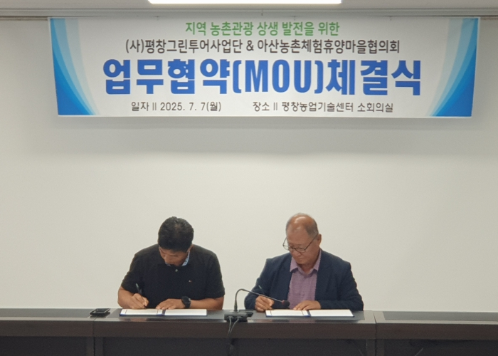 [뉴스노크=김인호 기자] (사)평창그린투어 사업단은 지난 7월 7일 농촌 관광정책의 발전과 창의적 관광사업 도입을 위하여 아산시 농촌체험휴양마을협의회와 농촌관광 사업에 대한 업무협약(MOU)을 체결했다.