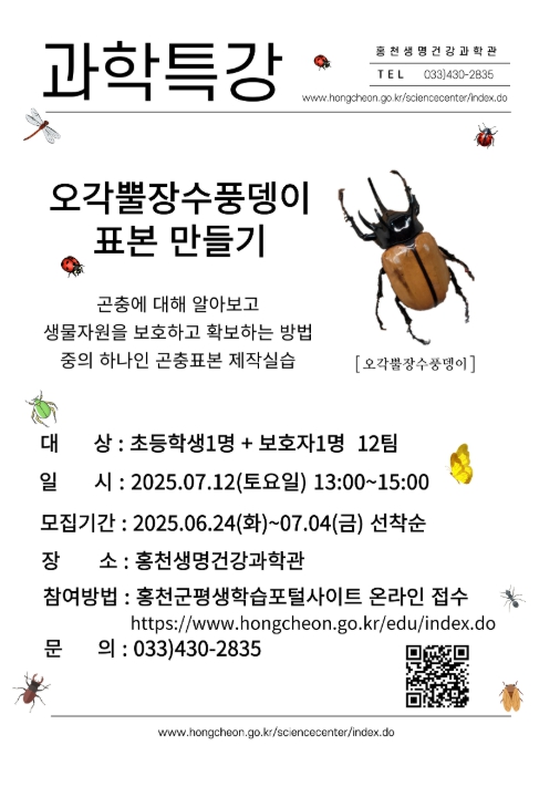 홍천생명건강과학관은 오는 7월 12일 특별한 체험 프로그램 '오각뿔장수풍뎅이 표본 만들기‘ 특강을 마련했다.