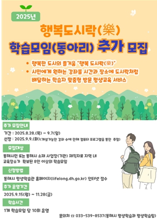 [뉴스노크=김인호 기자] 동해시는 학습자 맞춤형 평생학습 프로그램인 '행복도시락 강좌' 를 오는 9월부터 11월까지 추가 운영한다고 밝혔다.