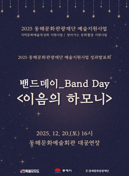 성과 보고 이후에는 지역에서 활발하게 활동하고 있는 ▲하얀민들레▲동해밴드 ▲제로이스트 ▲더캐럿츠 ▲밴드장수 등 5개 팀이 참여하는 연말 특별 공연 ‘이음의 하모니가’가 이어진다.