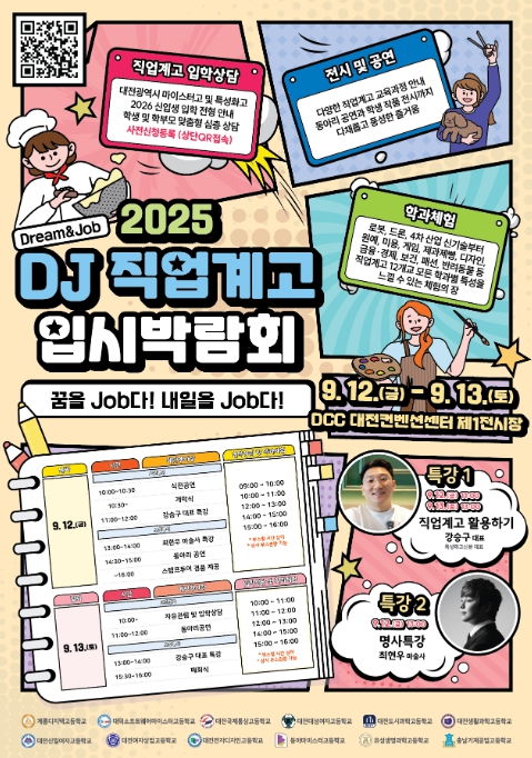 [뉴스노크=김인호 기자] 대전시교육청은 9월 12일부터 9월 13일 양일간 오전 9시부터 오후 16시까지 대전컨벤션센터(DCC) 제1전시장에서 “꿈을 Job다! 내일을 Job다!”라는 주제로 ‘2025 DJ(Dream&Job) 직업계고 입시박람회’를 실시한다고 밝혔다.