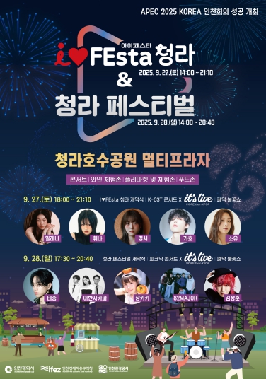 [뉴스노크=김인호 기자] 인천경제자유구역청이 주최하고 인천관광공사(사장 백현)가 주관하는‘2025 I♥FEsta 청라 & 청라 페스티벌’이 9월 27일과 27일 이틀간 청라 호수공원 멀티프라자에서 열린다.