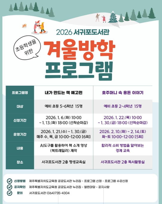 [뉴스노크=김인호 기자] 제주도교육청 서귀포도서관은 겨울방학을 맞아 어린이들의 호기심을 자극해 책 읽기의 즐거움과 경제 감각을 키우는 겨울방학 프로그램을 운영하며, 내년 1월 6일부터 참가자를 모집한다.