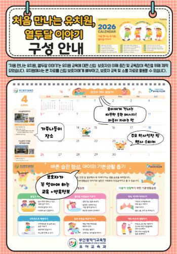 [뉴스노크=김인호 기자] 부산광역시교육청은 2026학년도 유치원 입학을 앞둔 학부모들의 불안감을 해소하고 유치원 교육에 대한 이해를 돕기 위해 ‘처음 만나는 유치원, 열두 달 이야기’자료 12,500부를 제작해 유치원별로 배포한다고 24일 밝혔다.