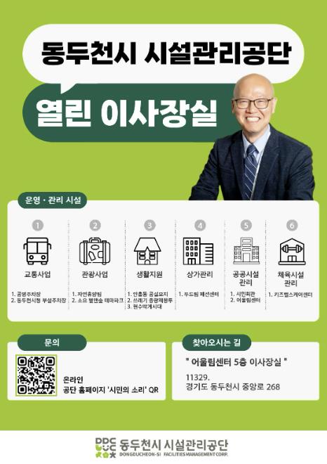 [뉴스노크=김인호 기자] 동두천시 시설관리공단은 시민과의 소통을 강화하고 현장의 목소리를 경영에 적극 반영하기 위해 10월부터 ‘열린 이사장실’을 연중 상시 운영한다고 밝혔다.